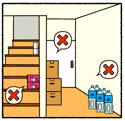 買い物をしたものが入ったままのビニール袋や段ボールなど、つまずきやすかったり避けて通らなければならなかったりするものはないかチェック。こうした床を塞ぐものは、ふだんから転倒の危険があるだけでなく、いざというときの逃げ道をなくすことにも。別の場所に移動させるか処分しましょう。